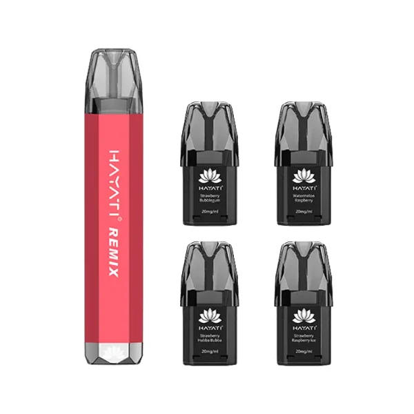 The Hayati Remix 2400 Vape Pod Kit is a new mouth-to-lung (MTL) vaping device. It features an internal rechargeable 500mAh battery and is packaged with four prefilled pods. Each pod provides up to 600 puffs, totalling 2400 puffs per kit.